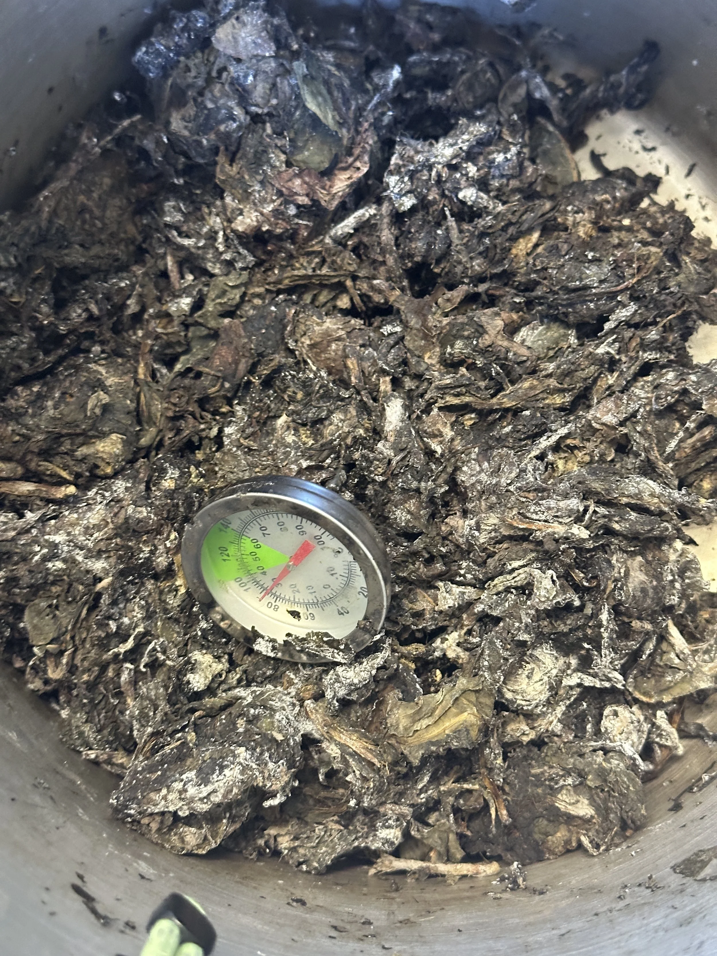 I can see the downside to the smelly paste and did a second composting from 1.5 kilos of leaves, I didn’t totally dry them out as is traditional, but left some moisture in them, this worked very well, the leaves smelt of tobacco, and went mouldy really quickly, again these were kept in a warm place, they naturally went up to 40 degrees, and then as it got mouldier the temps dropped. Two weeks in and it looks like this: