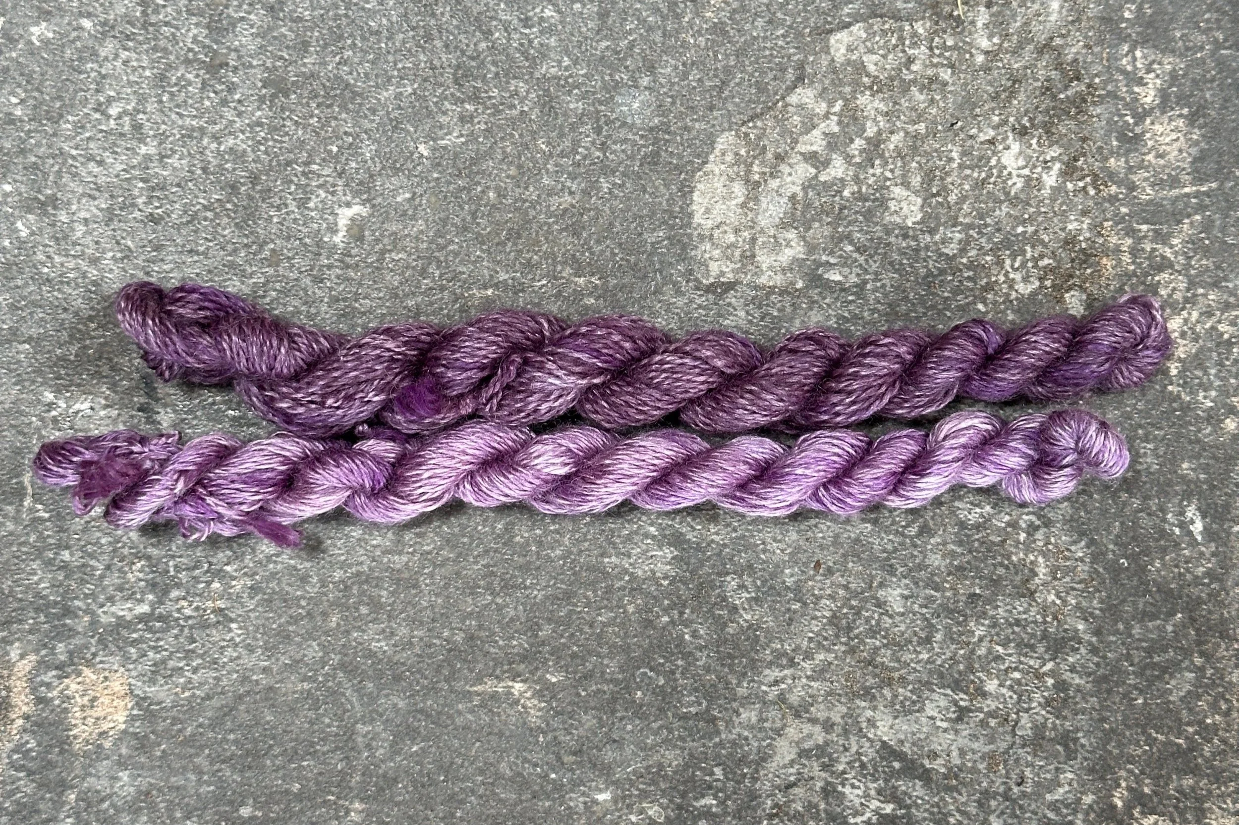 Since Alkinet is often better soaked in Alcohol as the dye molecules aren’t very soluble in water, I decided to try this instead. I purchased some Isopropyl Alcohol and soaked the dyed chopped root overnight in a jam jar, and then the next morning strained off the alcohol that was now bright red and added some warm water. I popped this in a jam Jar and added two 3g embroidery skeins, one pure silk and the other bfl/silk blend, and put the jar in my Bain Marie and controlled the temps so it was a lot lower, around 60C. I left the skeins in for around an hour and I finally got purple! I believe shifting the pH with Soda ash increases the Blue tones, so I will try that next time, but for now I feel much more confident when it comes to using my own roots. The colour is not meant to be very colourfast, so I will do a little test to see how colourfast it actually is, but I’m not particularly worried, its a gorgeous colour and its super fun to grow and use this dye plant.
